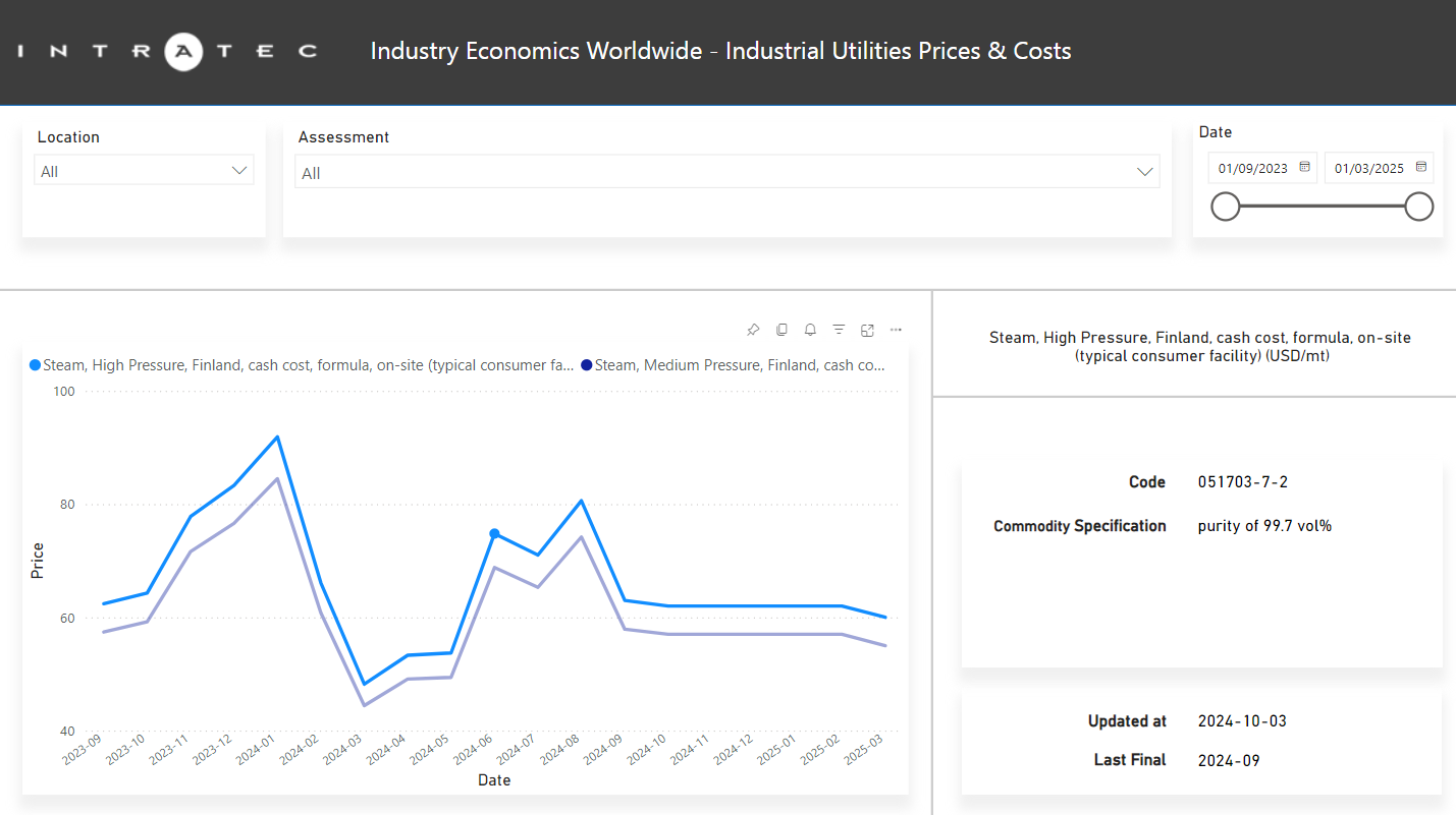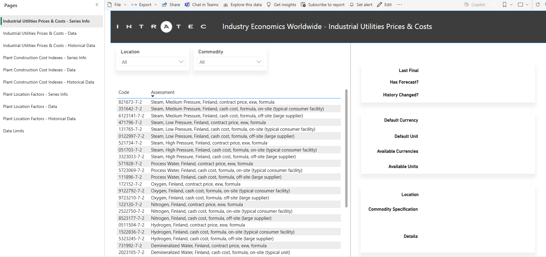 By selecting an assessment on the Industrial Utilities Prices & Costs - Series Info page, the user may check the following details on the right side of the dashboard: