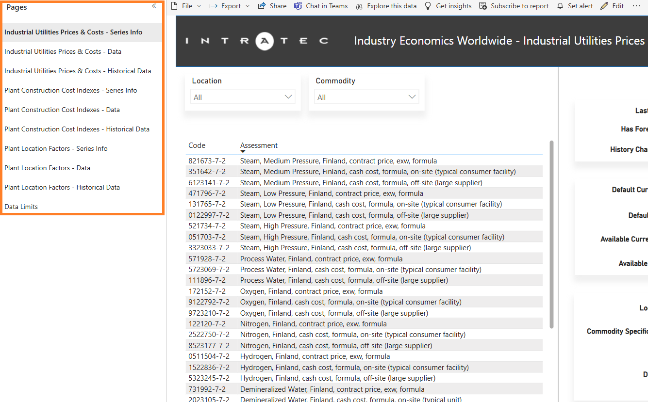The Intratec Industry Economics Worldwide Power BI Dashboard is divided into pages, which can be navigated through the left bar on Power BI online, as shown in the screenshot below.