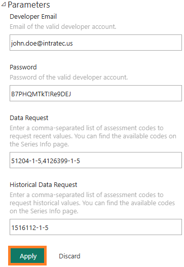 - Under Parameters, fill the credentials with a valid Developer account's Email and Password.
