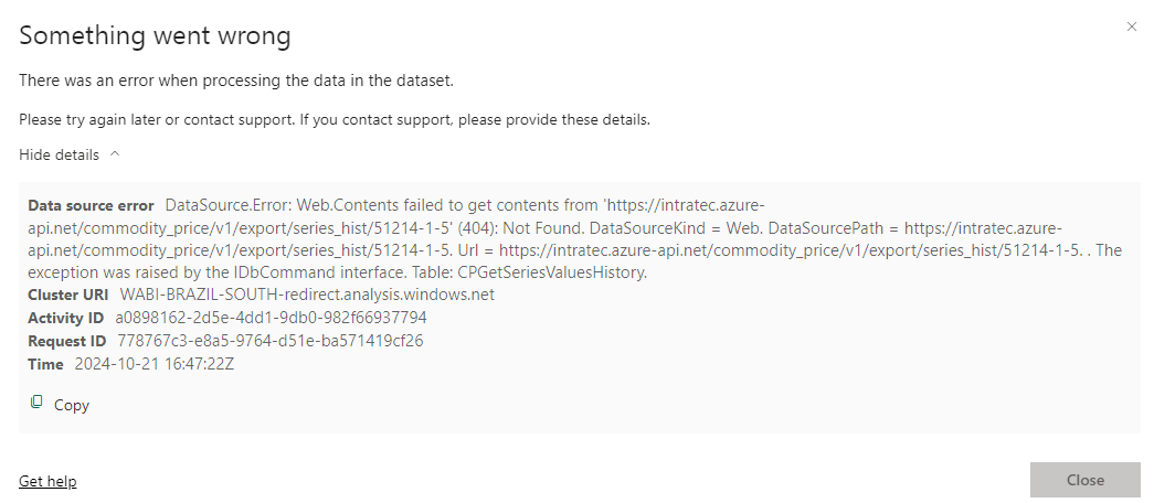 Each time a new request is made, the results from the previous request are replaced. To avoid losing data, if you need to request values from multiple assessments and view them separately, Intratec recommends either downloading the data before making a new request or setting up multiple Power BI dashboards, each focused on a different group of price assessments. This prevents unnecessary requests for the same data and ensures you do not lose previously retrieved information.